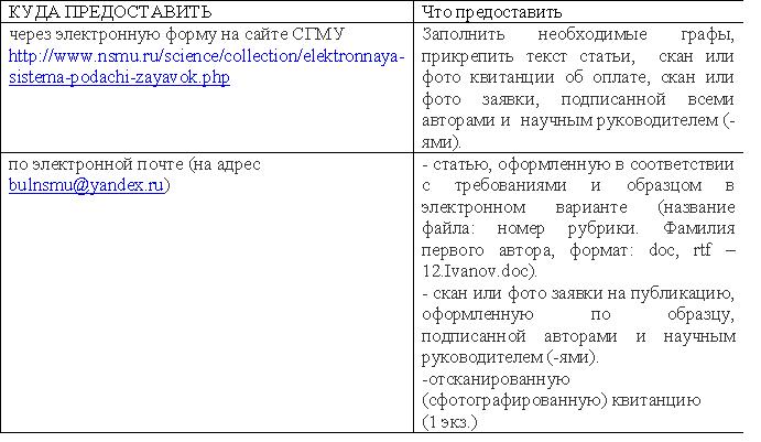 | Бюллетень СГМУ 1-2018Бюллетень СГМУ №1-2018  скачать  Информационное письмо по конференции скачать Требования к публикациям скачать Заявка на публикацию скачать Квитанция для оплаты скачать Электронная система подачи заявок на публикацию Образец оформления статьи скачать Информация об оплате через Сбербанк-онлайн ПРАВИЛА ОПУБЛИКОВАНИЯ РАБОТ В  БЮЛЛЕТЕНЕ СГМУ № 1 2018 ГОДА    В Бюллетене №1-2018 года можно опубликовать: - тезисы и материалы докладов V Международного молодежного медицинского научно-образовательного форума «Медицина будущего – Арктике» - научную статью вне зависимости от участия в V Международном молодежном медицинском научно-образовательном форуме «Медицина будущего – Арктике»   ПОРЯДОК ПРЕДОСТАВЛЕНИЯ РАБОТ:  1. Желающие опубликовать статью в журнале Бюллетень СГМУ №1-2018 г. должны предоставить до 15 марта 2018 г. включительно следующие материалы: а) статью, оформленную в соответствии с требованиями и образцом; б) заявку на публикацию, оформленную по образцу, с подписями всех авторов и научного руководителя; в) отсканированную (сфотографированную) квитанцию. При подаче материалов в имени файла необходимо указать фамилию автора (первого автора, если авторов несколько) и номер раздела (например: 10. Марков Е.Е.-статья, 10. Марков Е.Е.-анкета, 10. Марков Е.Е.-квитанция). При получении материалов Редколлегия проводит рецензирование материалов и в течение 14 дней после окончания приёма заявок на стайте СГМУ вывешивается список принятых заявок. Редколлегия оставляет за собой право отбора заявок, отклонения материалов, представленных с нарушением установленных требований, либо не содержащих достаточной научной новизны.  2. Возможна отправка материалов (статья и анкета) для предварительной проверки по предварительной договорённости с редколлегией. После проверки автору будет направлено письмо с результатами проверки. 3. Публикация статей будет осуществляться только после оплаты организационного взноса. Обязательно присылайте скан-копию (фотографию) документа, подтверждающего оплату! 4. При необходимости выдается справка о принятии статьи к публикации, которая изготавливается в течение 5-и рабочих дней 5. Статьи, присланные после окончания приёма заявок, могут быть опубликованы в следующих ближайших сборниках.  6. Каждая работа пересылается и оформляется отдельно с обязательным приложением квитанции об оплате (диски и файлы обратно не выдаются); 7. Работы можно подать одним из нижеописанных способов. Просьба не присылать одну и ту же заявку несколькими способами одновременно, т.к. это затрудняет обработку заявок. В случае, если будут представлены дублирующие заявки, то к печати будет принята только одна из присланных на усмотрение редколлегии.   ЗАЯВКУ НА ПУБЛИКАЦИЮ ТЕЗИСОВ В «БЮЛЛЕТЕНЬ СГМУ» МОЖНО ПОДАТЬ ЧЕРЕЗ САЙТ СГМУ  ИЛИ ПО ЭЛЕКТРОННОЙ ПОЧТЕ http://www.nsmu.ru/science/collection/elektronnaya-sistema-podachi-zayavok.php